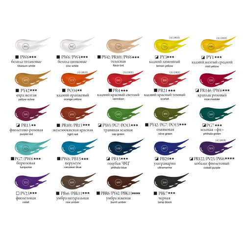 Содержание пигмента и масла сбалансировано таким образом, чтобы получить идеальную мягкую консистенцию, позволяющую писать даже неразбавленными красками. Тончайший перетир пигмента дает возможность идеально смешивать цвета красок, а также работать методом лессировок, добиваясь акварельного эффекта.